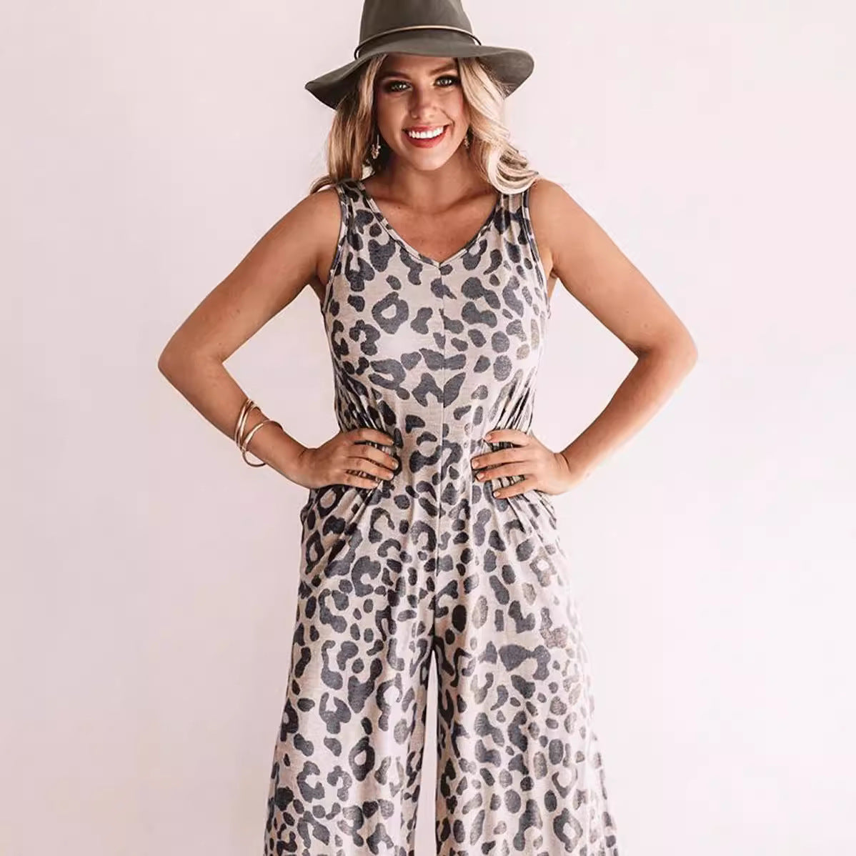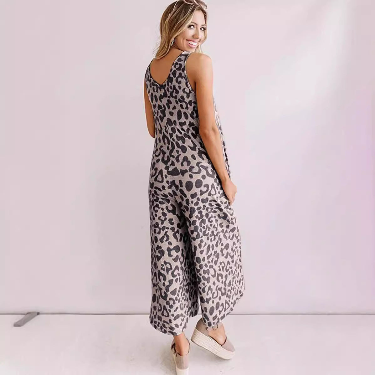 This Women's Sleeveless Jumpsuit combines style and comfort, featuring a flattering V-neck and a bold leopard print. Crafted from lightweight and breathable fabric, it is perfect for warm weather, making it an excellent choice for casual outings and summer events.