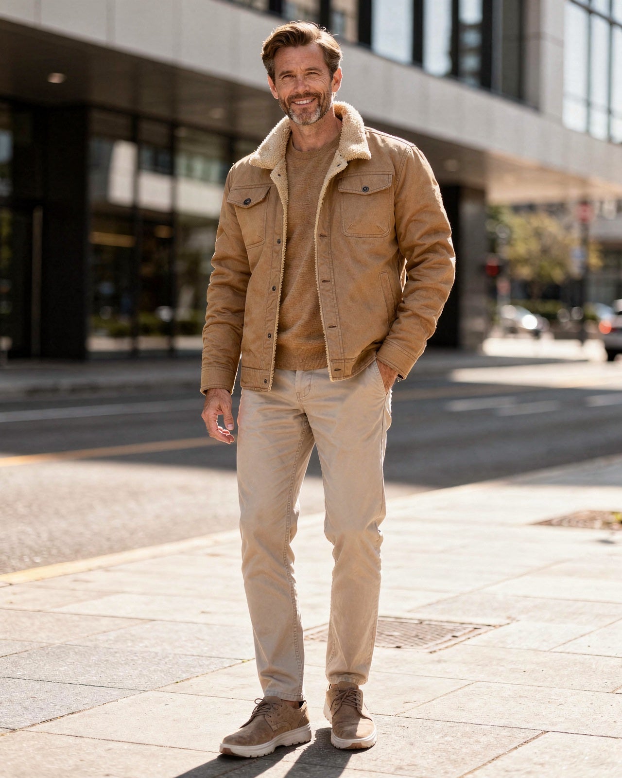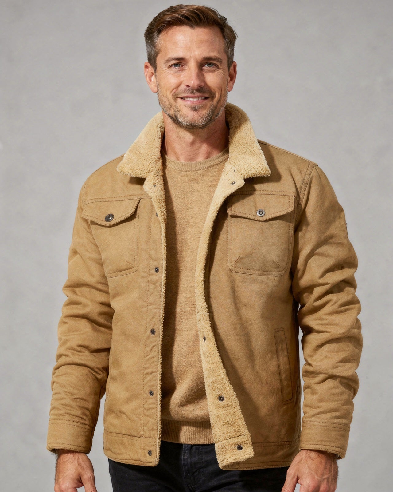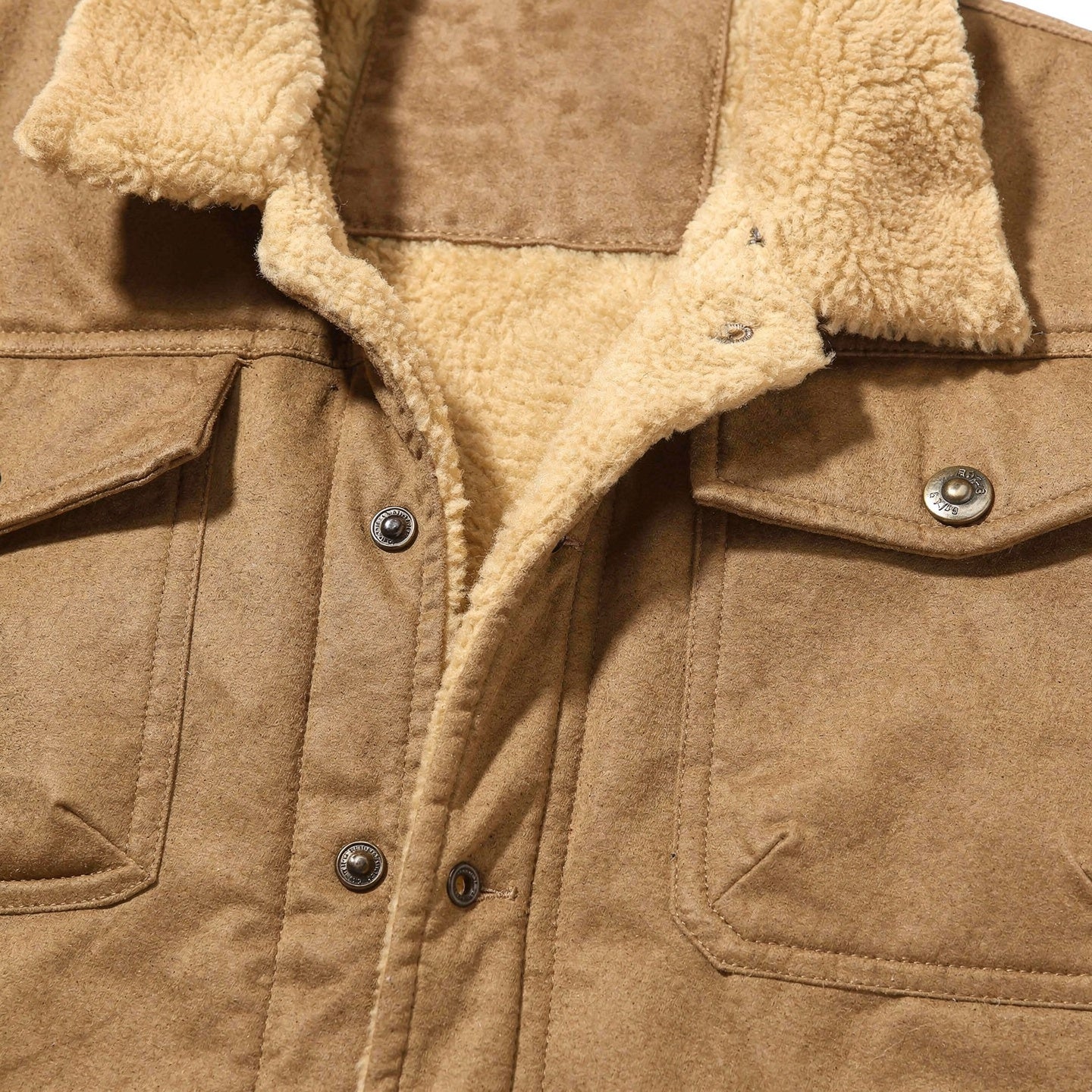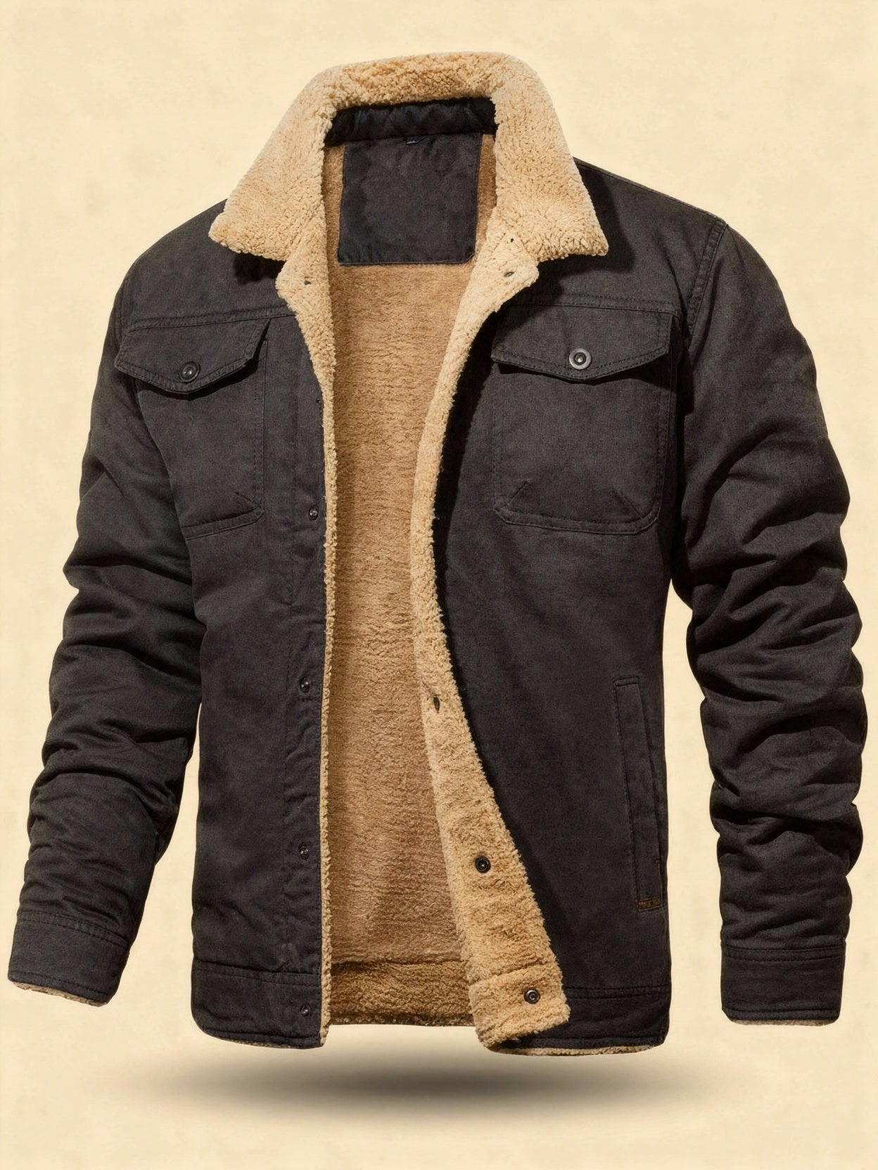This shearling collar lined jacket is designed for warmth and durability, making it an essential piece for the colder months. The structured outer shell combined with a soft interior lining ensures reliable comfort. Featuring a pointed collar, button-front closure, and practical chest pockets, this jacket offers a timeless utility look that is perfect for both casual and smart-casual occasions.