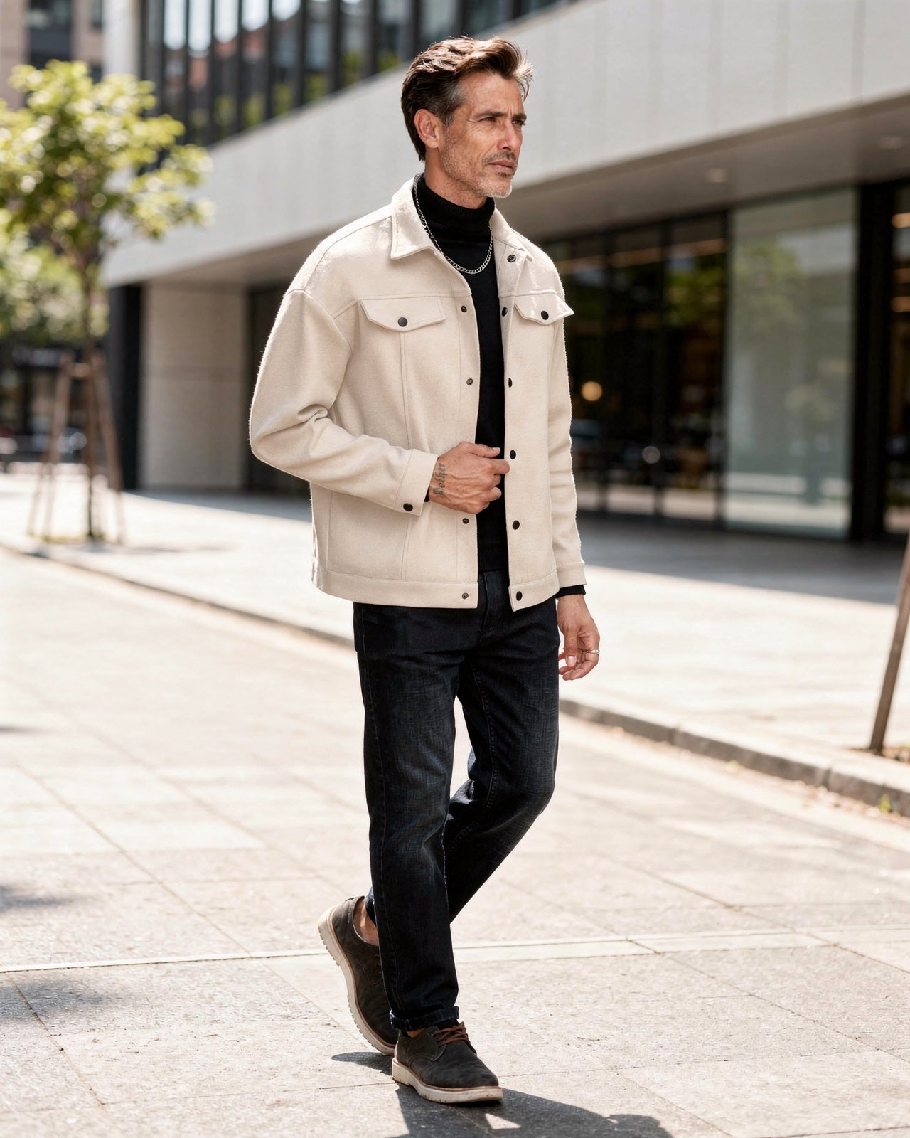 This men's smart casual jacket effortlessly combines casual and refined style, making it a versatile addition to any wardrobe. With a structured collar and practical front pockets, it offers both functionality and elegance. Perfect for layering over knitwear or shirts, this jacket is suitable for various occasions, from weekdays to weekend outings.