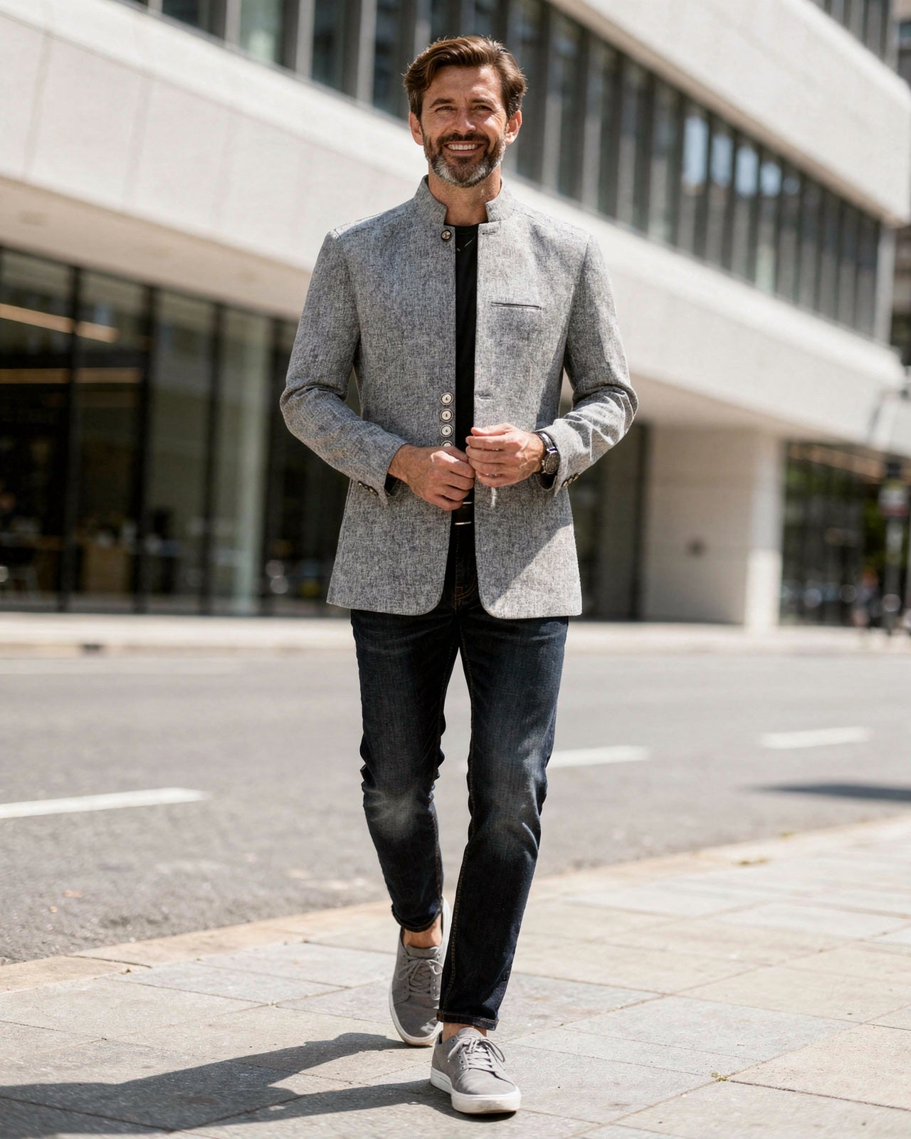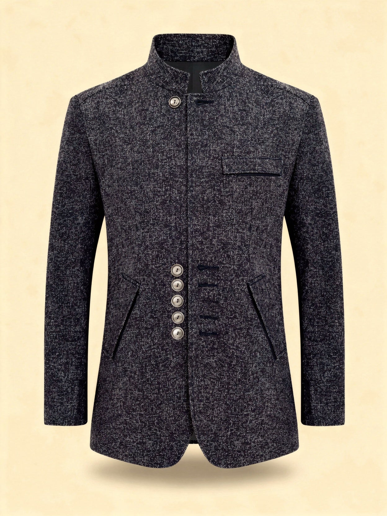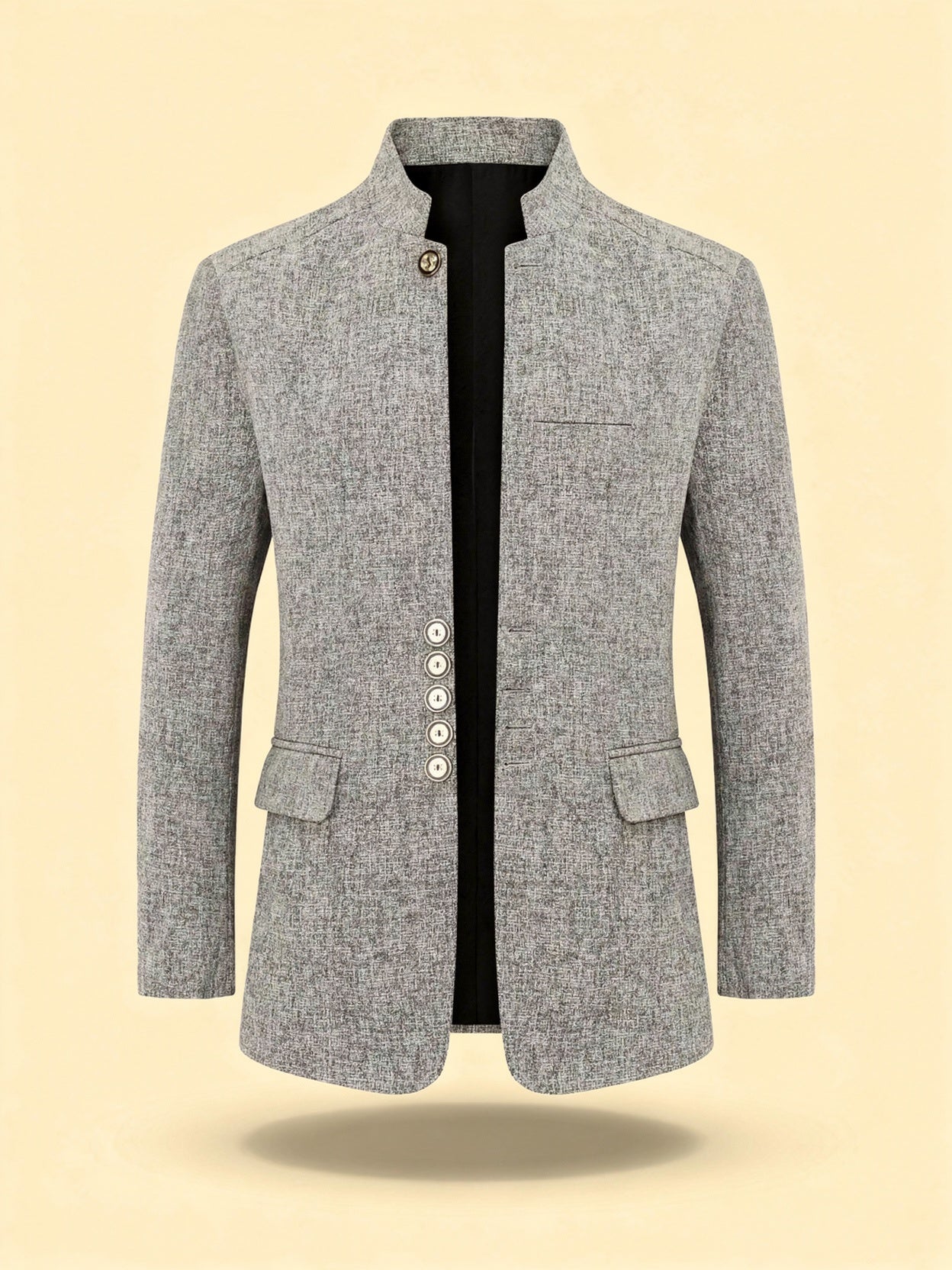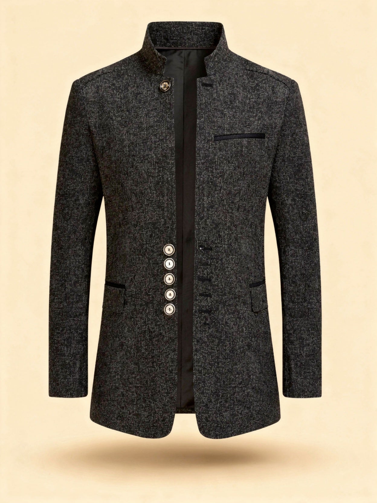 This men's stand collar jacket combines refined style with contemporary design. The sleek single-breasted cut, complemented by polished buttons, offers a perfect blend of minimalism and sophistication. Ideal for smart casual gatherings, business meetings, or evening events, this jacket features functional pockets for added convenience.
