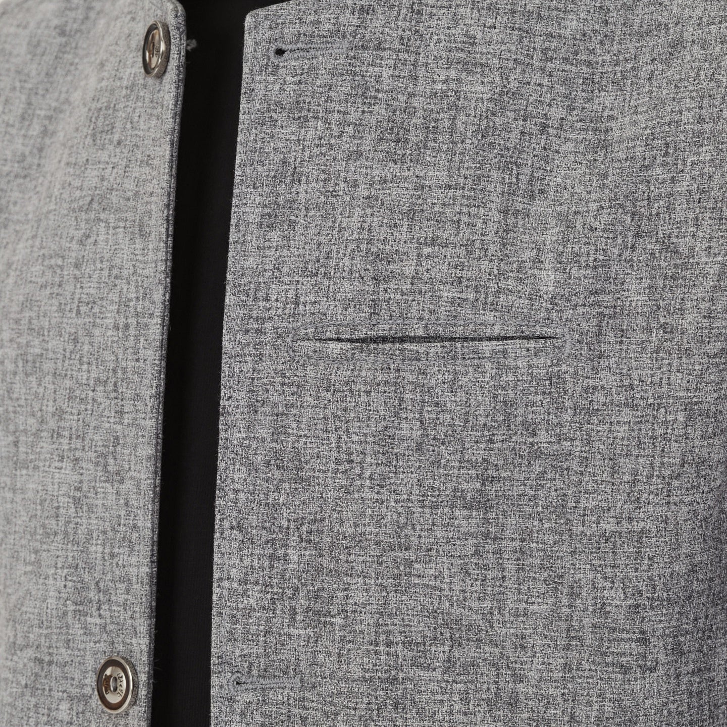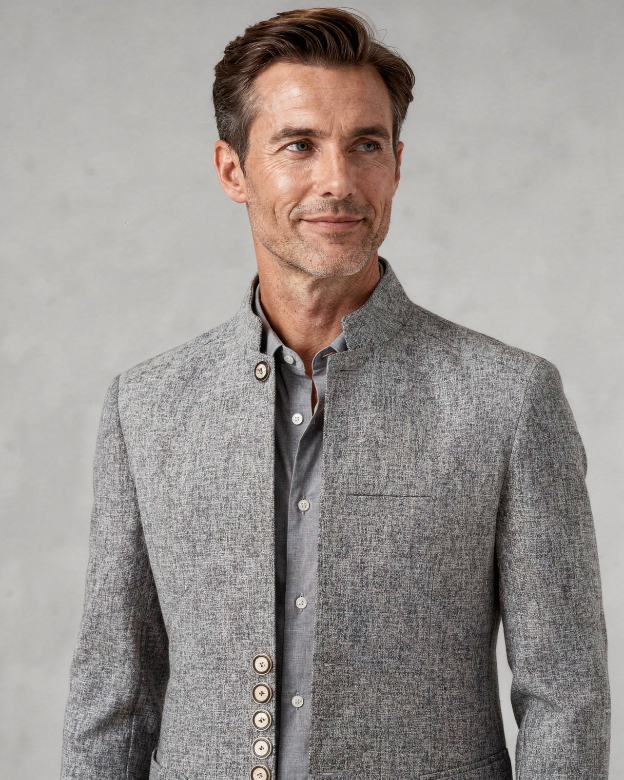 Design: Stand collar single-breasted jacket with button detailing