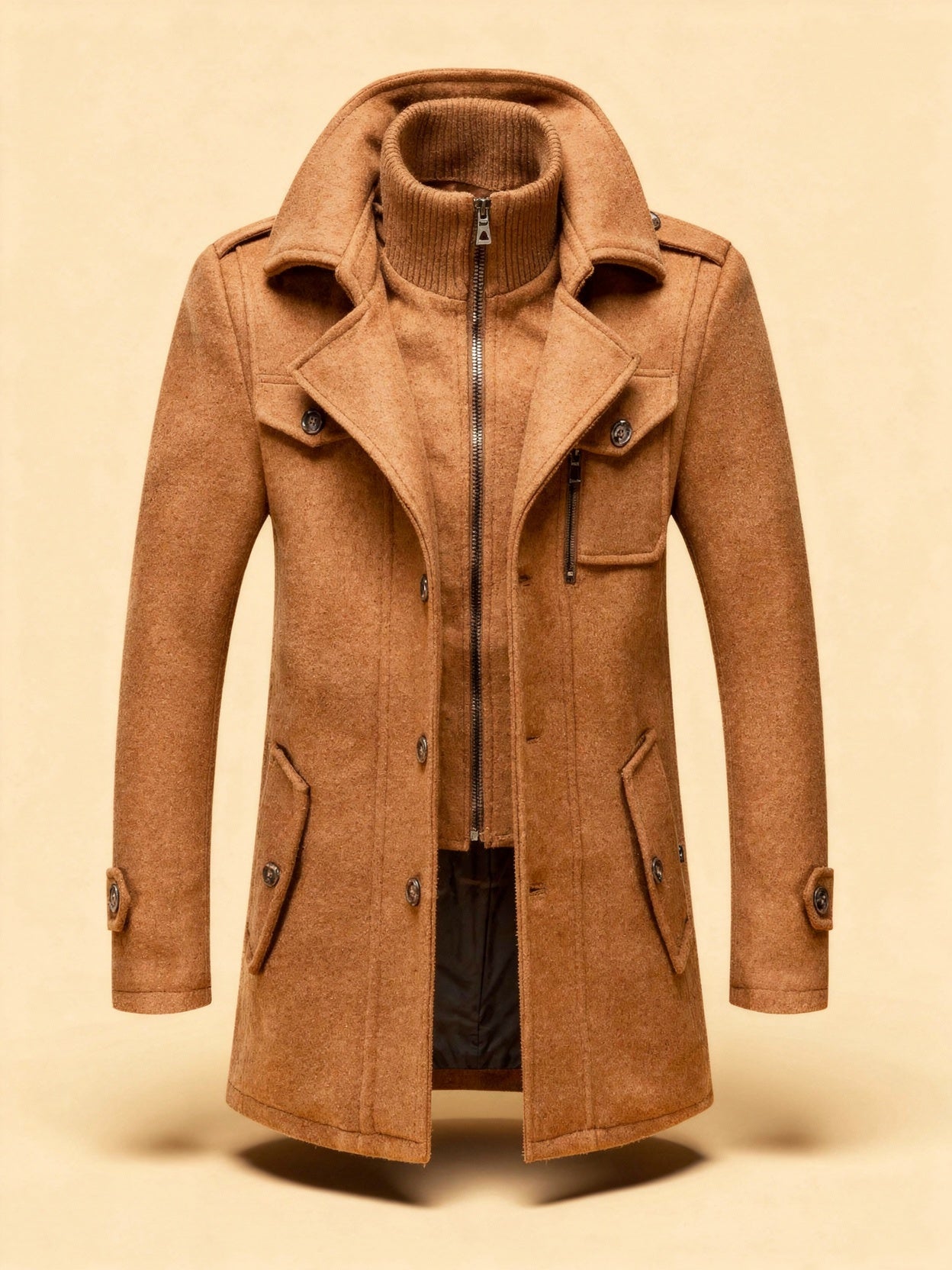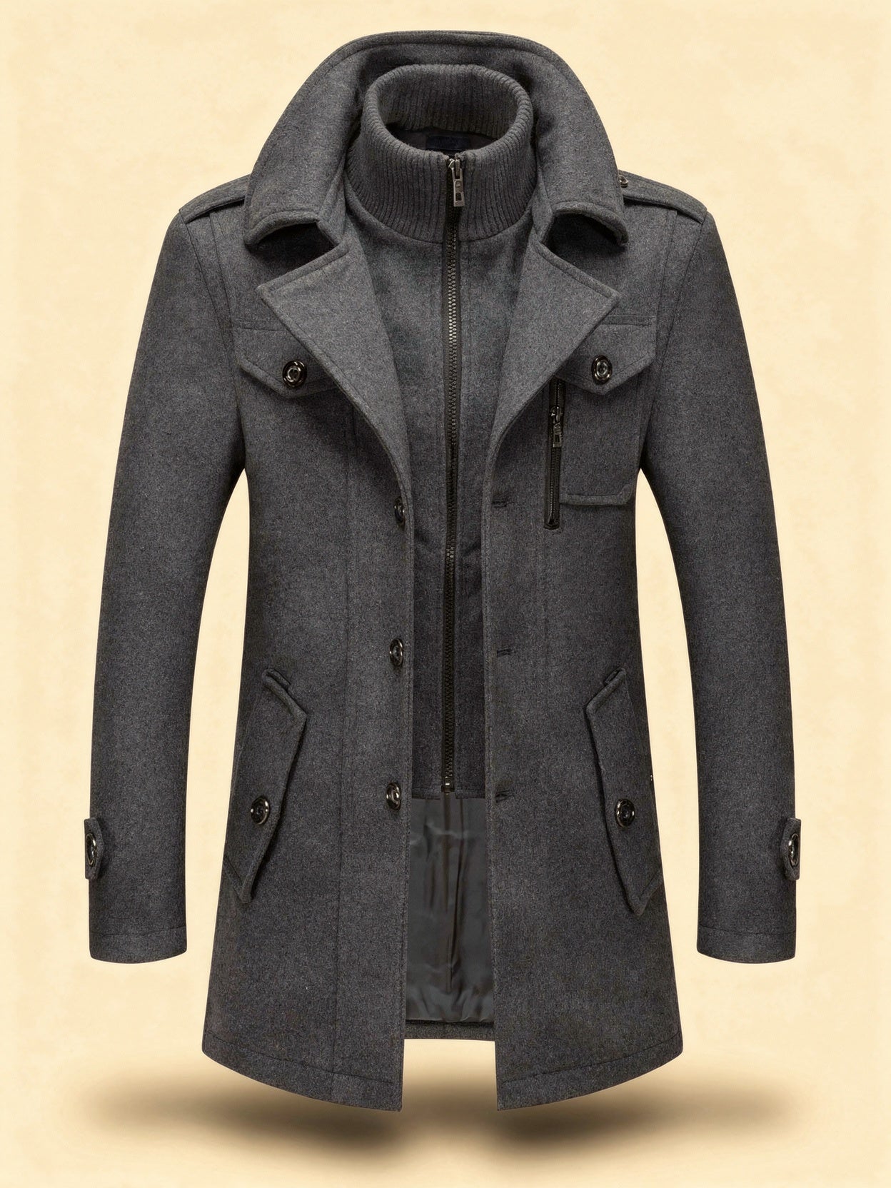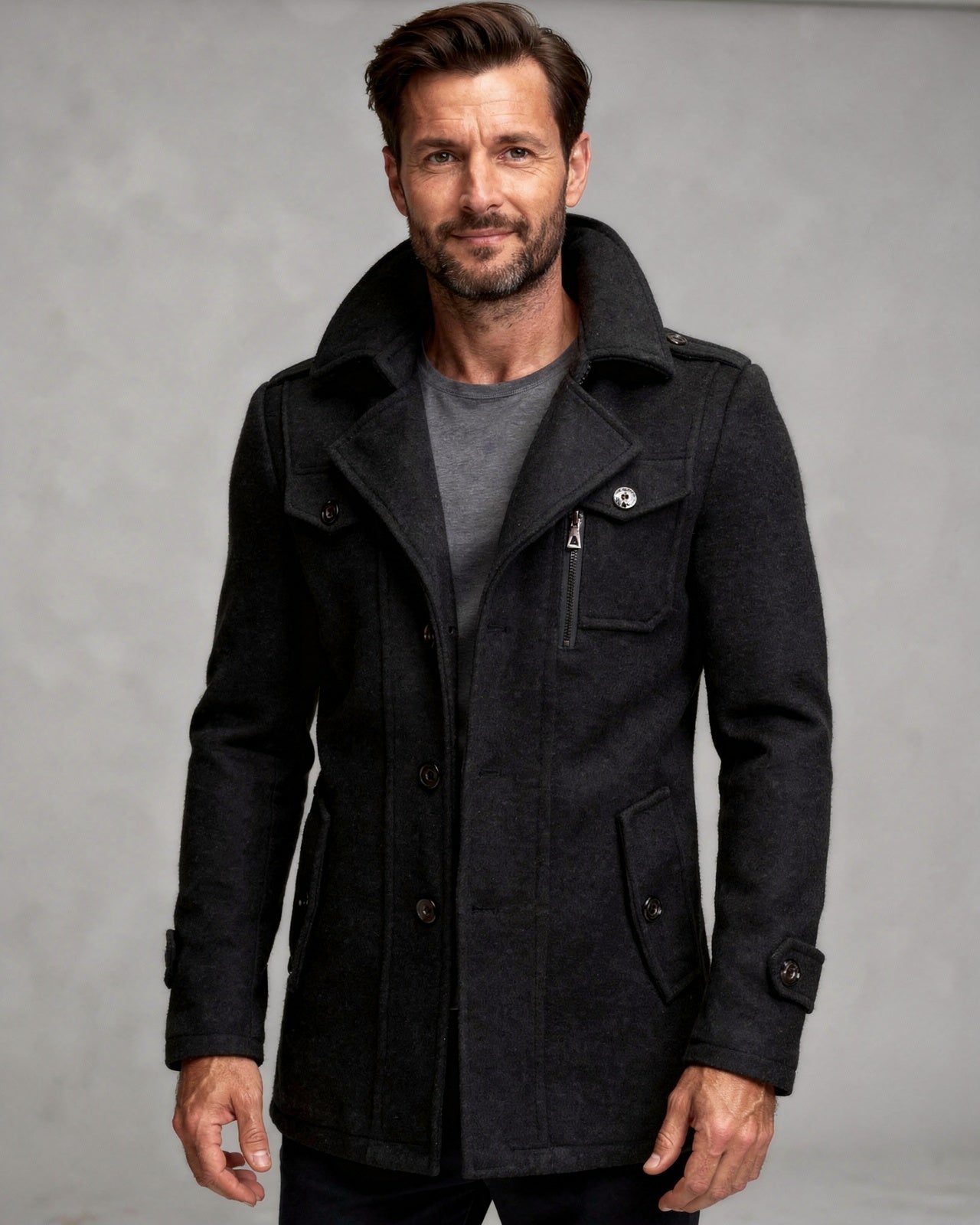 Crafted with sharp tailoring, this men's tailored military-inspired jacket offers a commanding silhouette that enhances everyday outfits. Featuring multiple flap and zip pockets, it combines functionality with style, making it an ideal layer over high-neck sweaters or crisp shirts. This versatile piece is perfect for work, weekends, or evening outings, striking a balance between utility and sophistication.