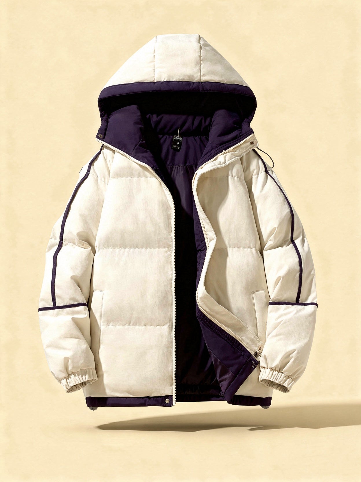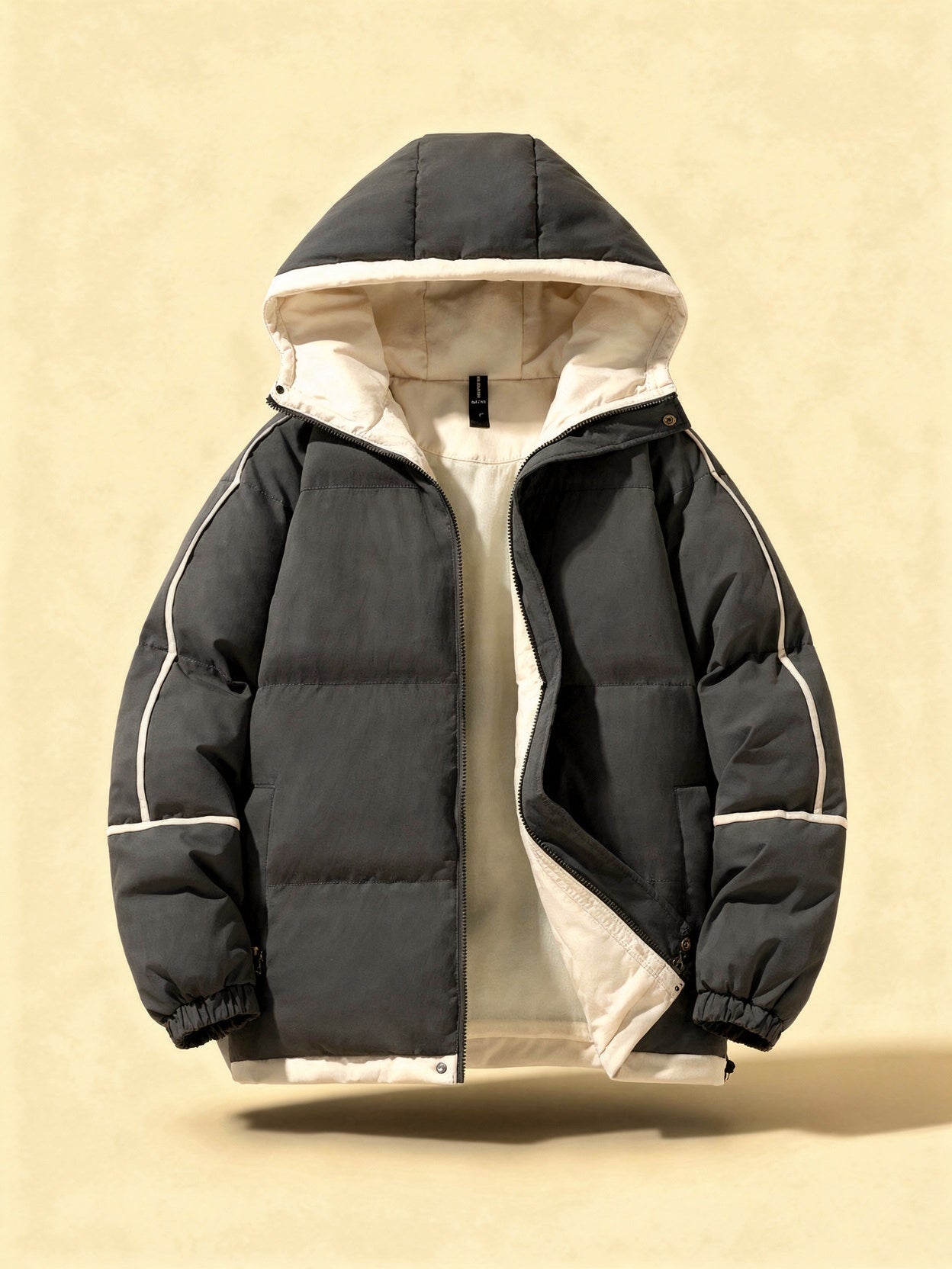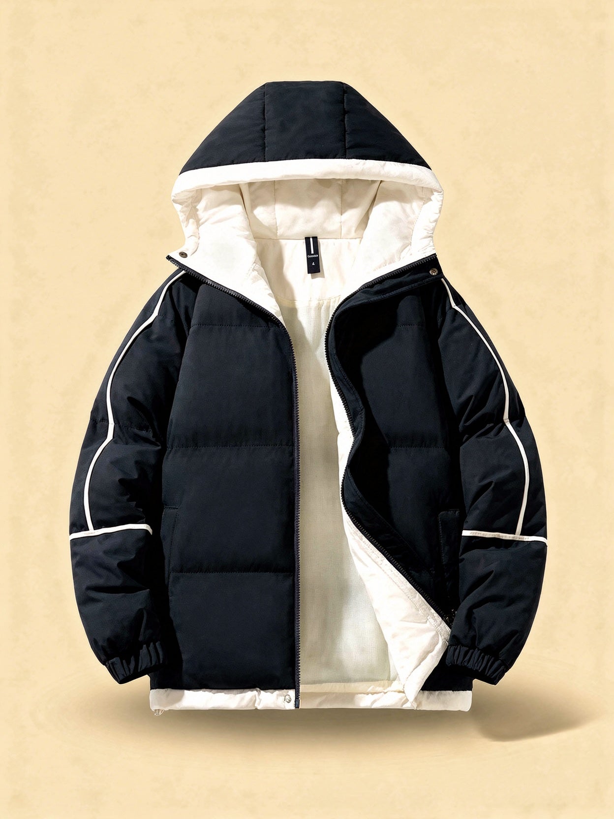 Design: Insulated hooded puffer parka with tailored fit