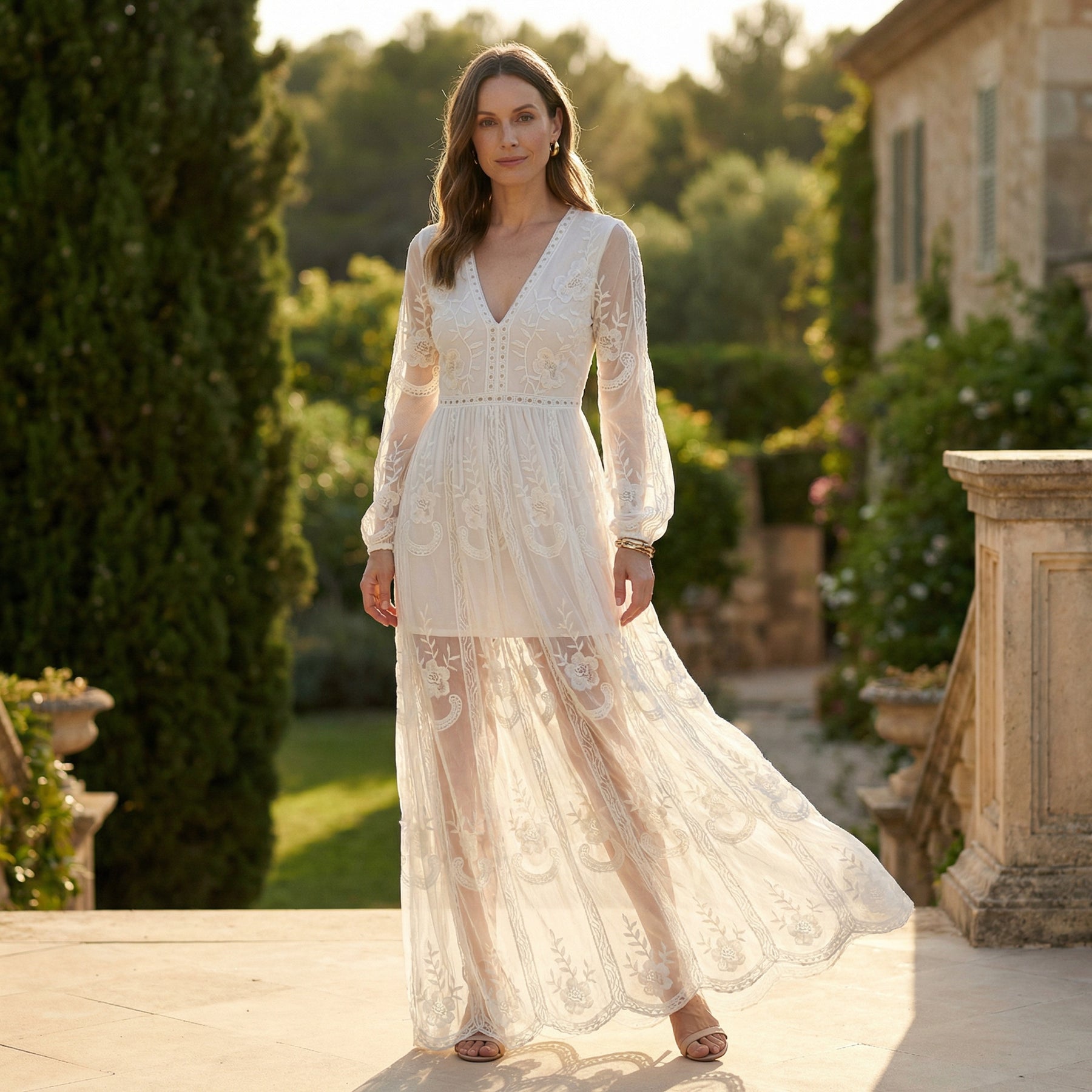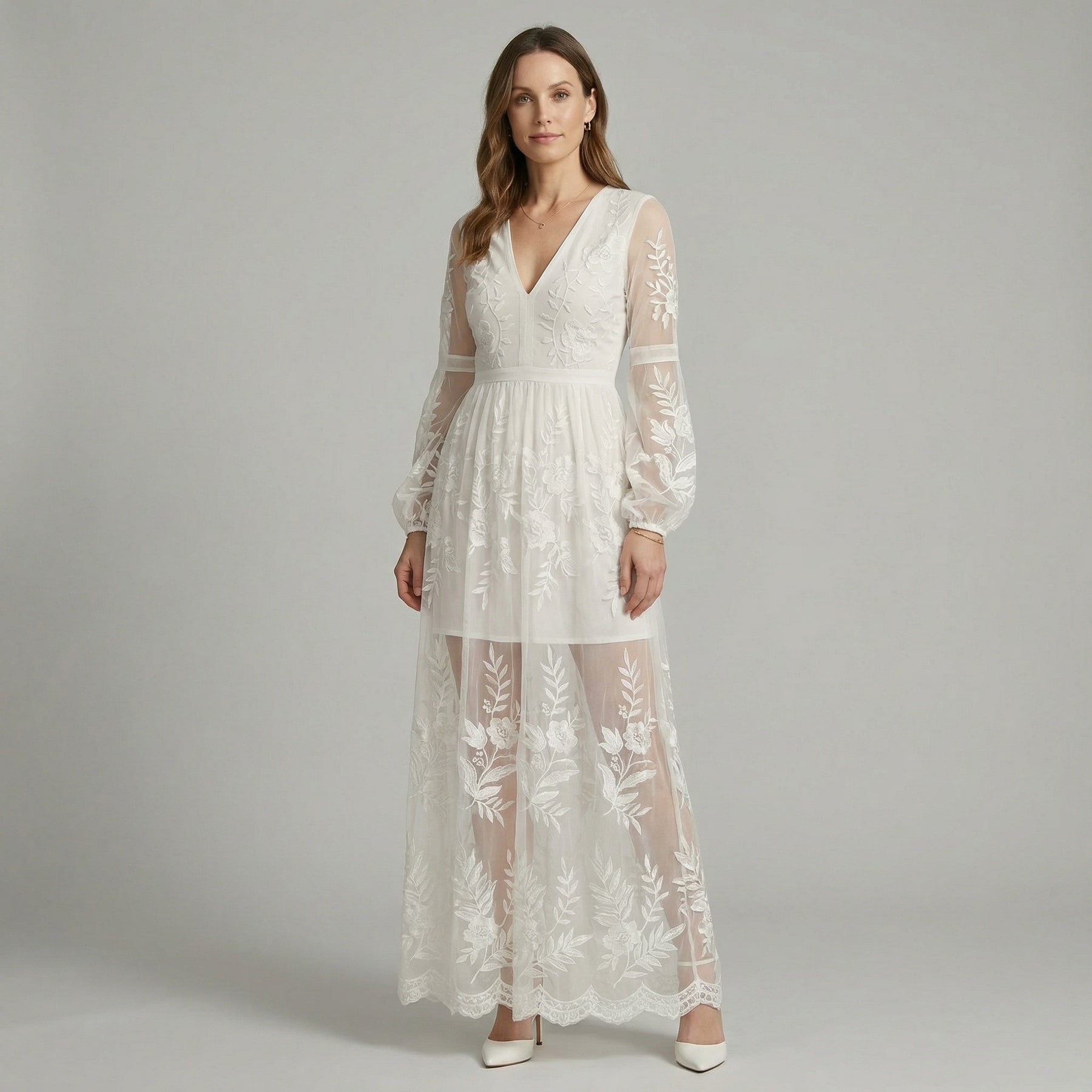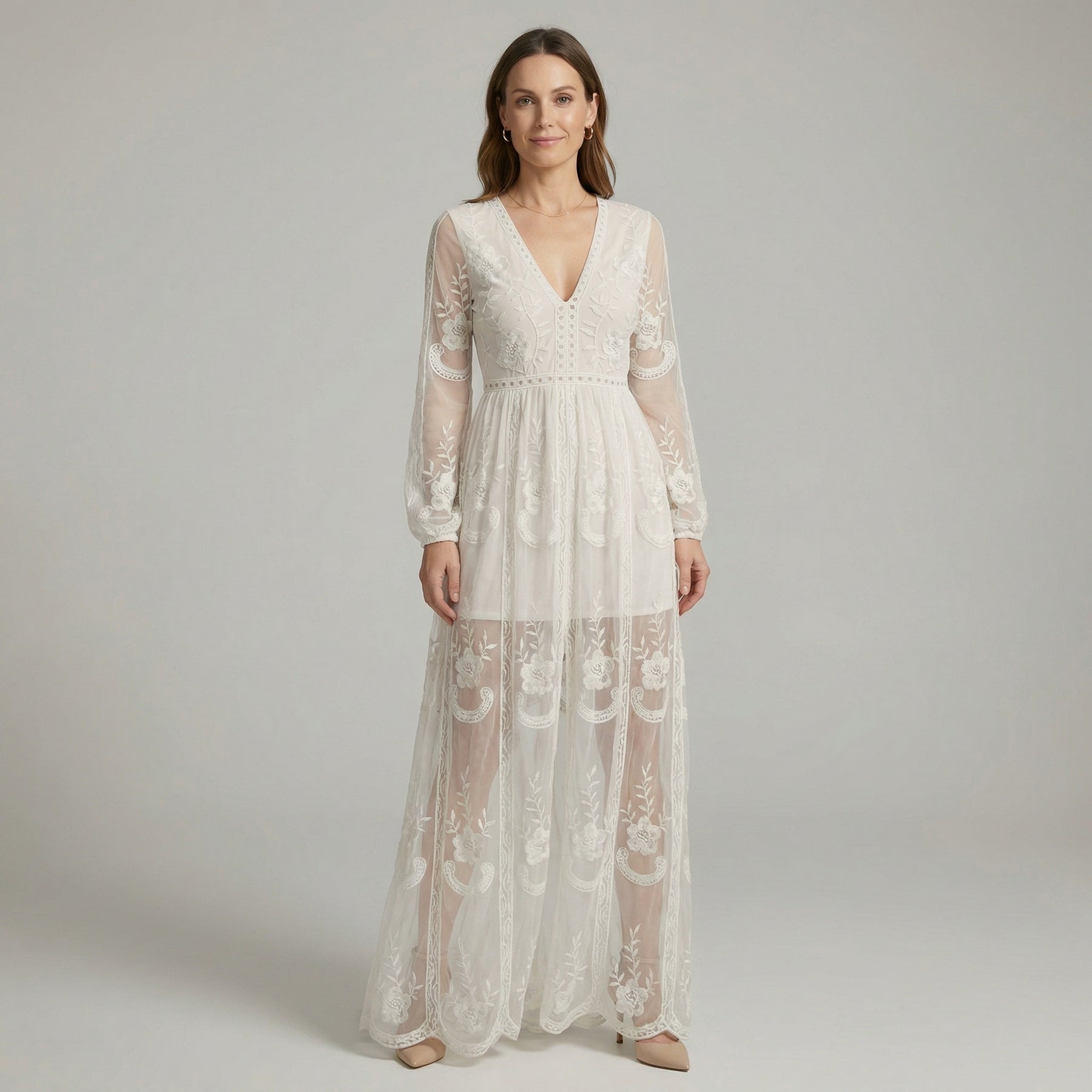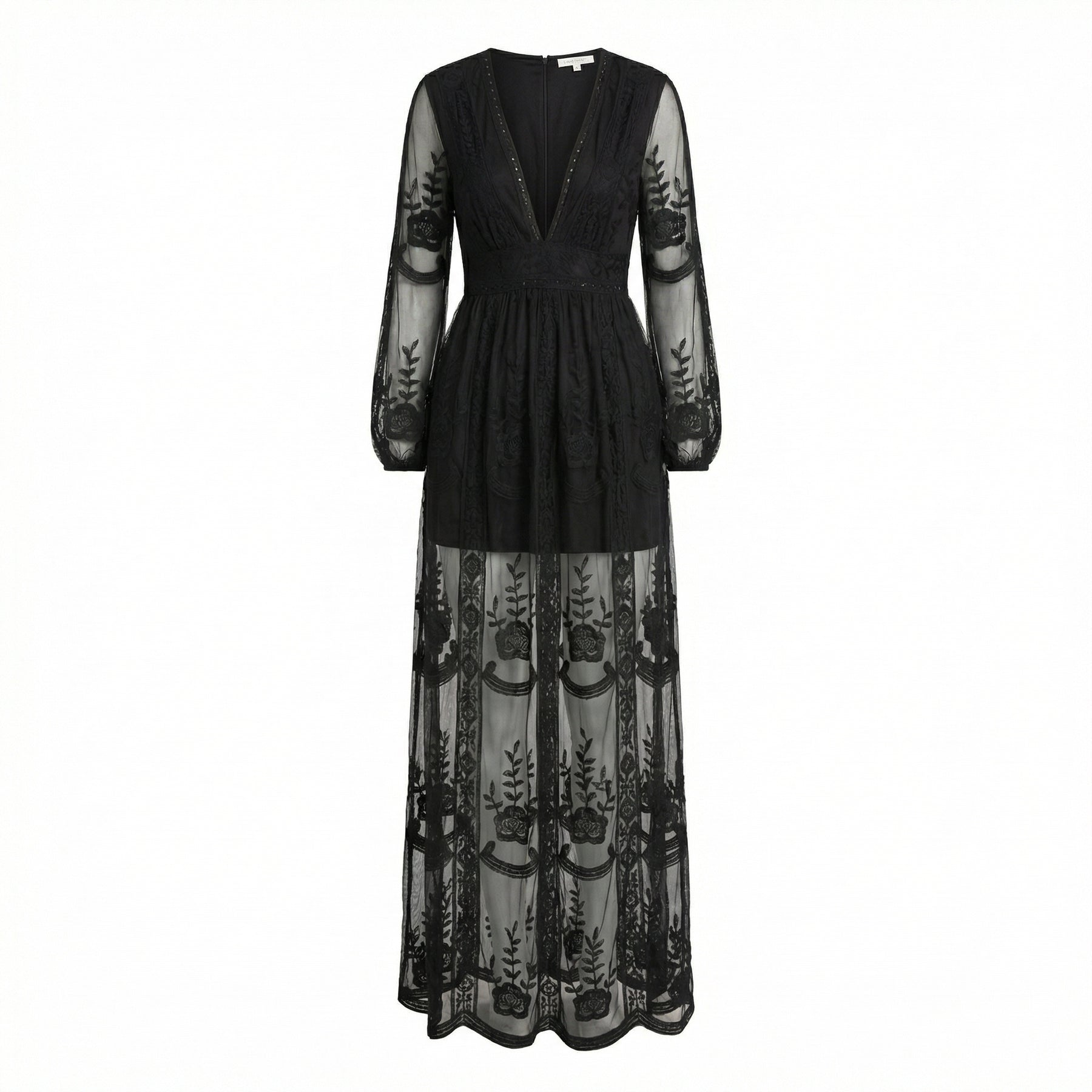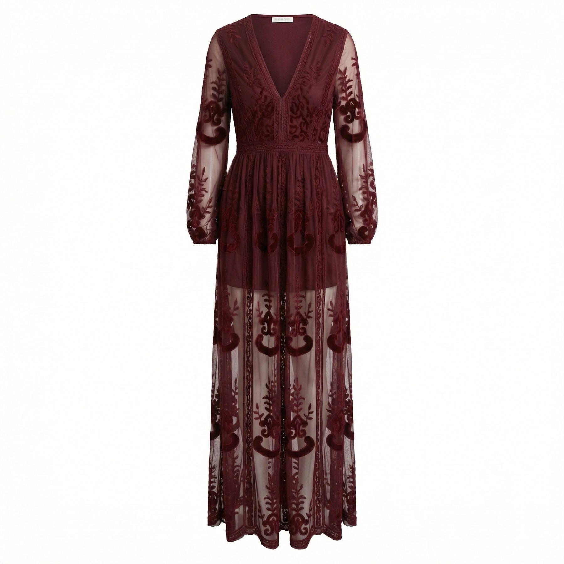 This stunning floral lace maxi dress features a sheer design with a deep V-neckline, long sleeves, and a stylish side slit. Perfect for various occasions, it combines elegance with modern flair, making it a versatile addition to your wardrobe. Dress it up with heels for formal events or keep it casual with sandals for a laid-back look.