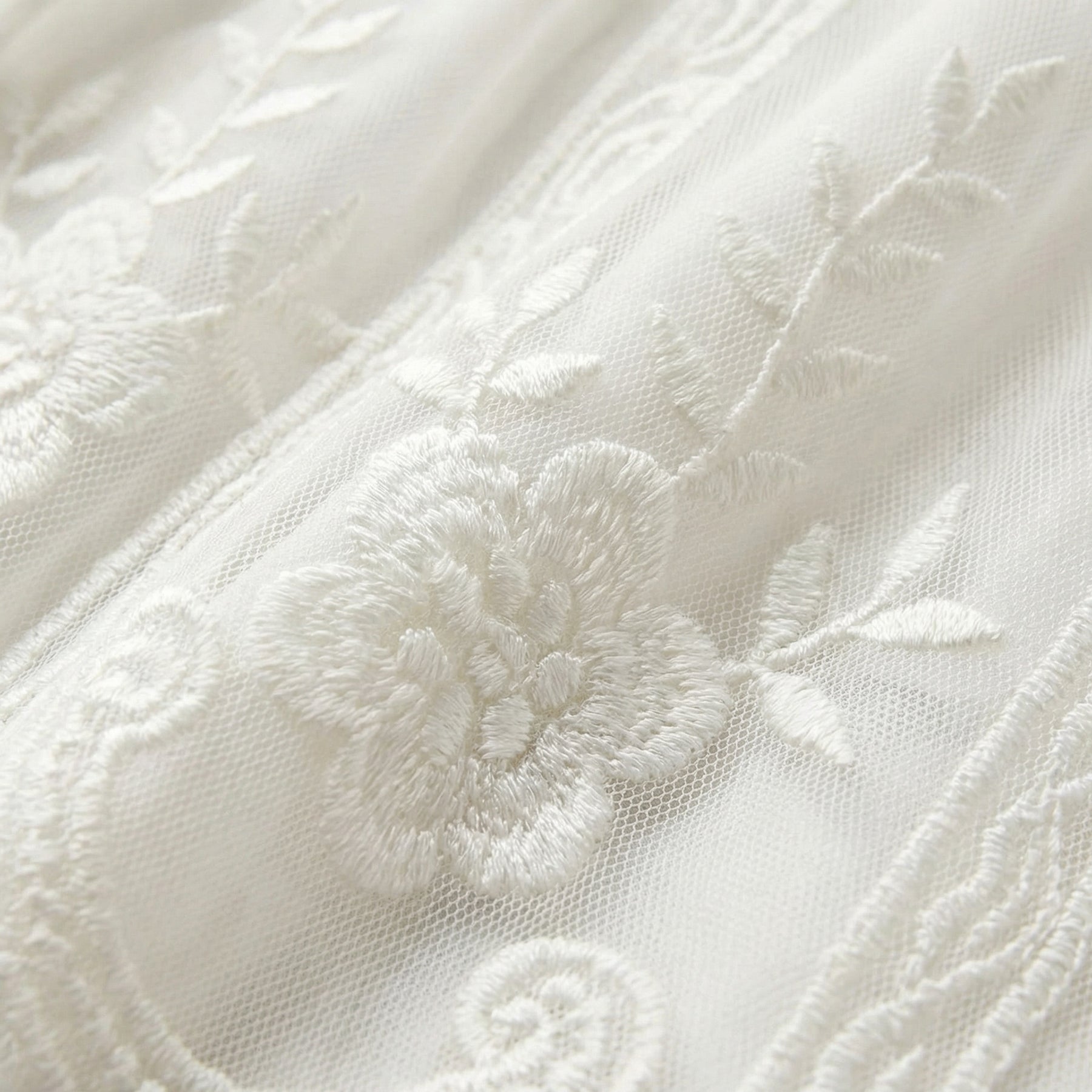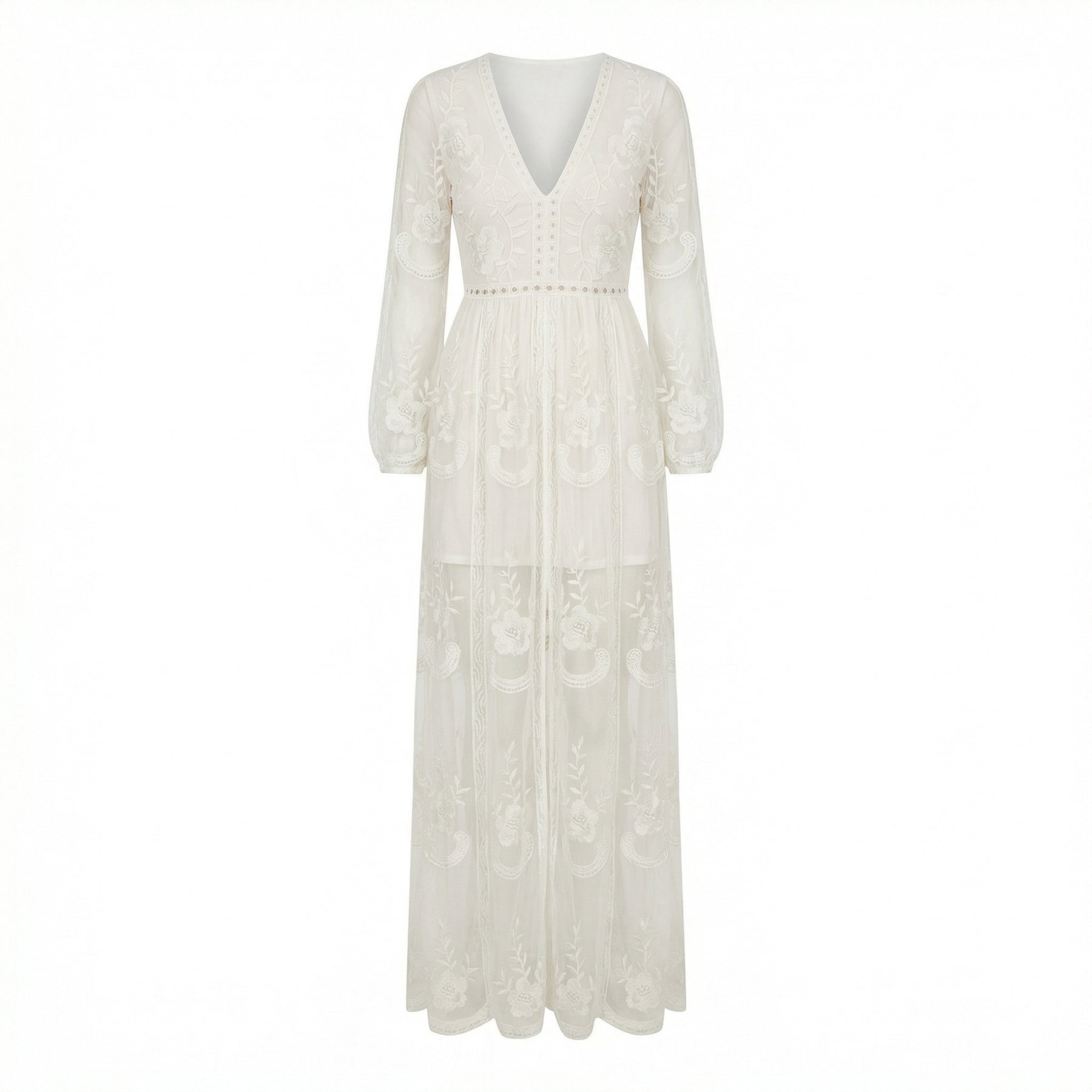 Design: Sheer floral lace, deep V-neck, long sleeves, side slit, maxi length